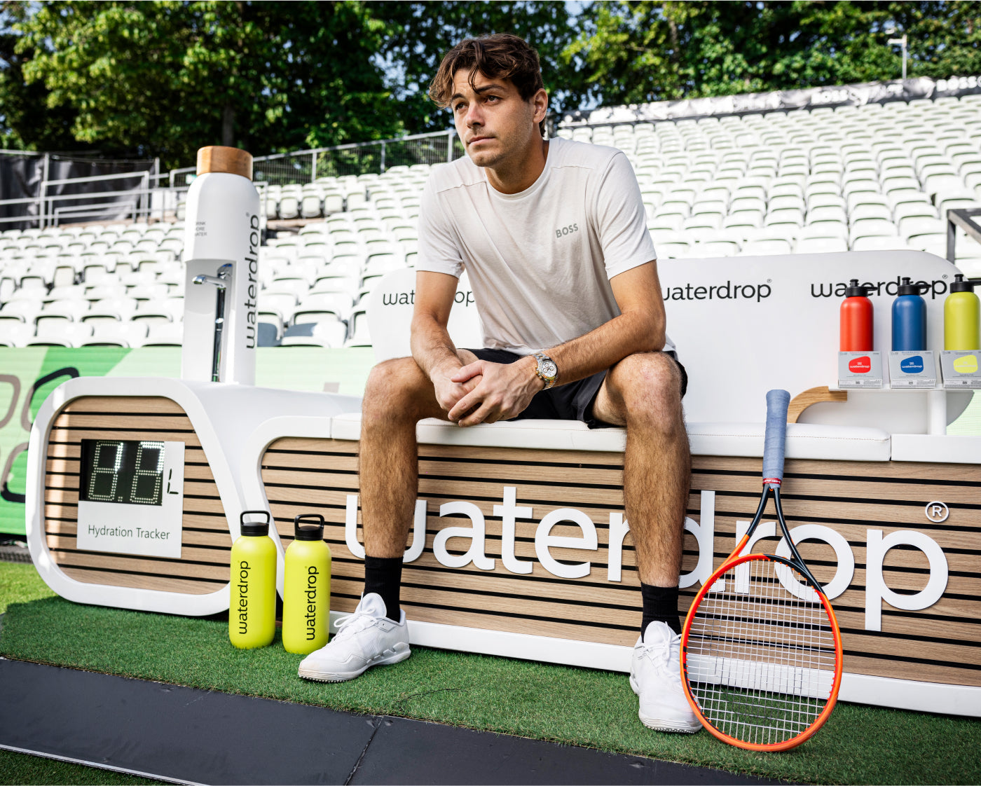 На турнирите на ATP (Асоциацията на професионалните тенисисти) по цял свят предоставяме специални хидратиращи пейки и станции, за да могат както играчите, така и феновете да се насладят на освежаващи напитки – без компромис с устойчивостта.